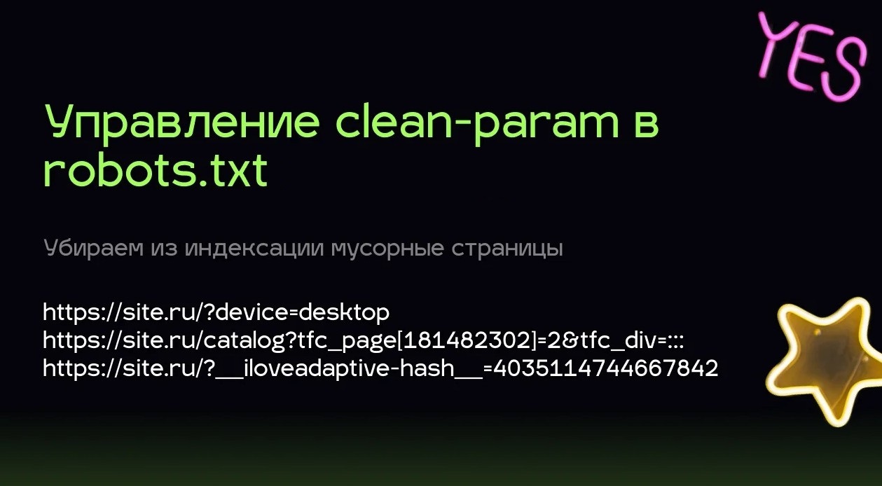 Страницы с параметрами обычно содержат один и тот же контент, как если бы эти параметры были бы убраны из URL страницы, из-за чего поисковики могут посчитать такие страницы полными ДУБЛЯМИ. Чтобы этого избежать для Яндекса, можно использовать директиву Clean-param в robots.txt. Правило работает только для Яндекса, на всякий случай повторюсь!